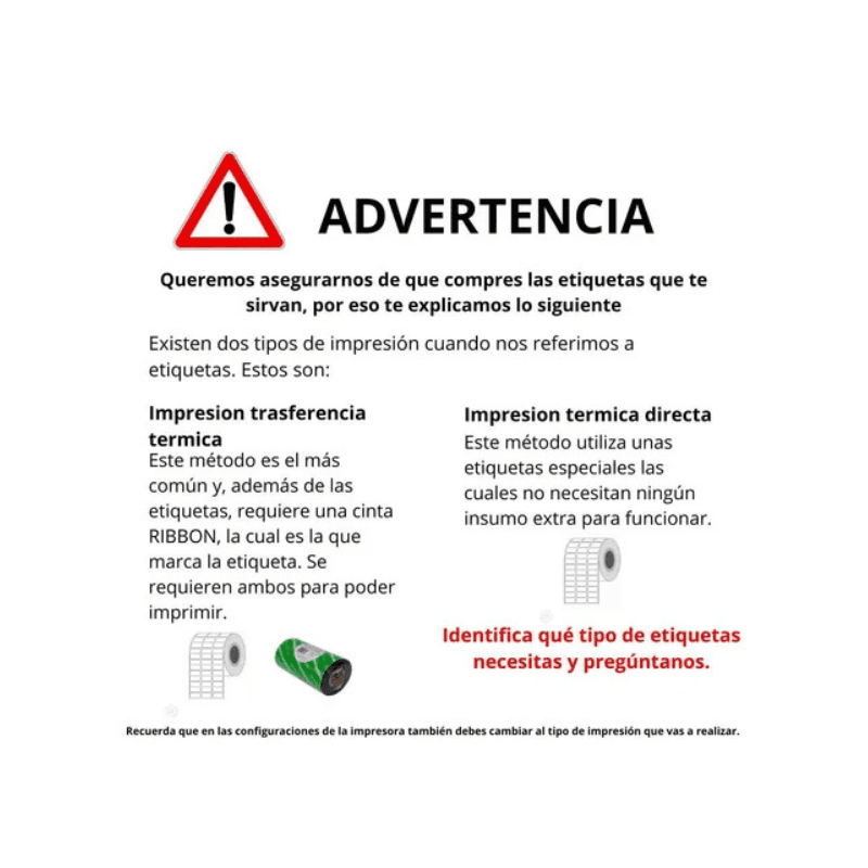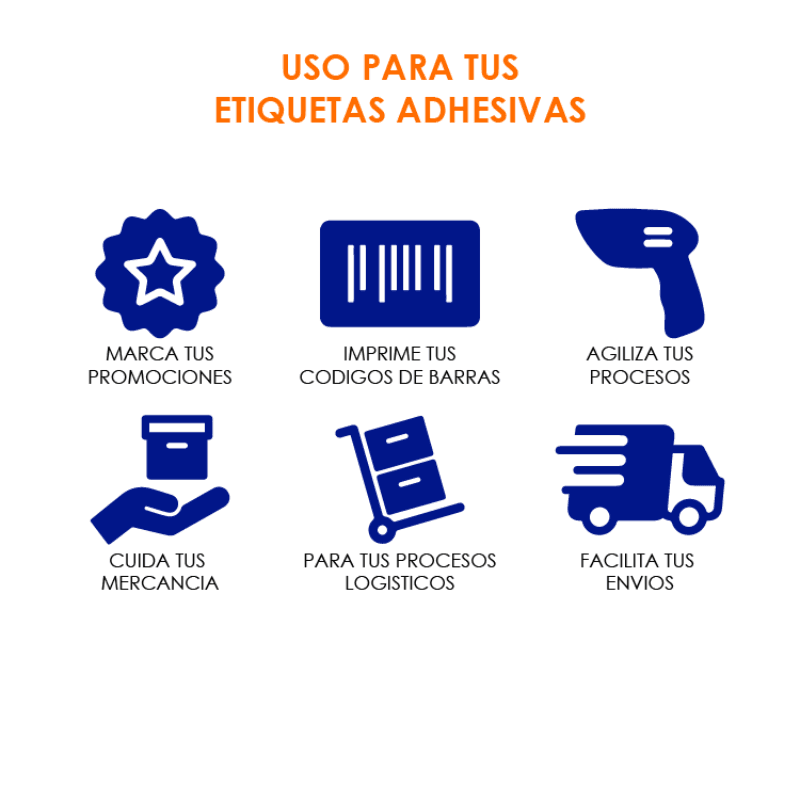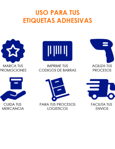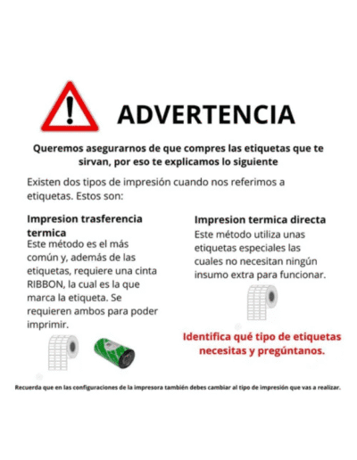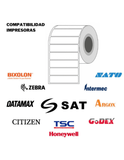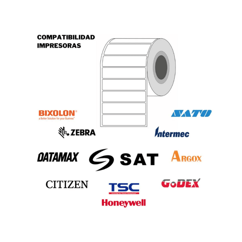 Hechas en papel térmico directo, no requieren ribbon y son compatibles con impresoras Zebra, TSC, SAT, Argox, Xprinter y otras. El adhesivo permanente asegura buena fijación en superficies plásticas, cartón, papel y más.